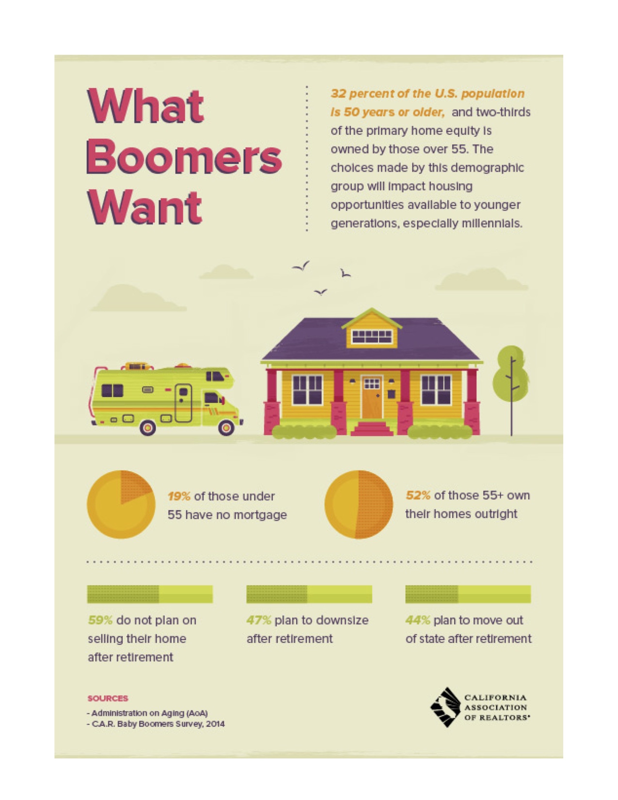 Fifty two percent of those 55 and over own their homes outright. For that population mortgage payments may not come into the equation. For the other half, retirement may bring with it a smaller fixed income making housing choices contingent on monthly mortgage costs. This could make a condo a better fit.