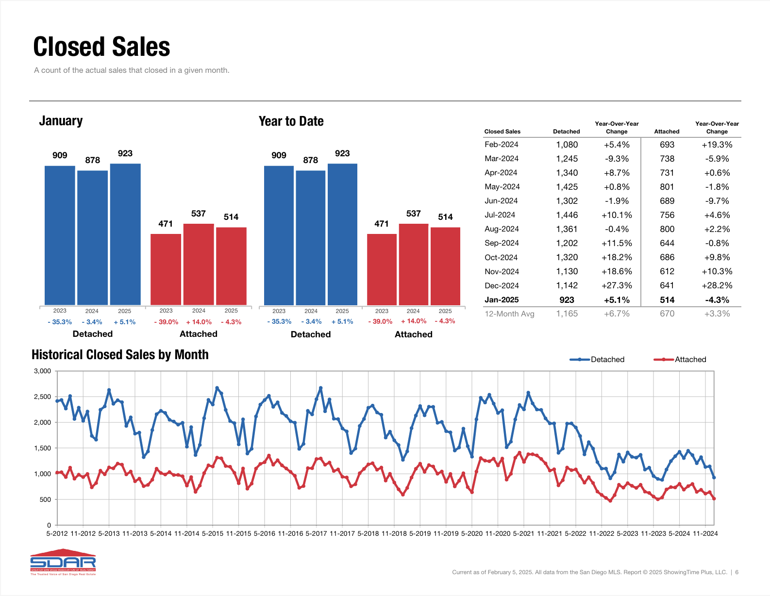 Between price, interest rates and wages, home ownership is too expensive for many people. So what needs to happen to get the real estate market going? Lansner said, "To get the current market back only to historically average affordability – 28% of income – mortgage rates must fall to 5.3%, household incomes must jump by 15%, or home prices need to drop 14%. Or some combination of this trio." Ugh. If you are interested in more stats read the entire article . Locally we are not struggling to the same extent. January showed detached closed home sales up 5.1 percent over 2024 but attached homes closed sales were down 4.3% over January 2024 according to SDAR. The graph below also provides a good visual on historical sales trends. You can see we are at historically low levels going back to 2012 but holding relatively steady with January in both 2023 and 2024.